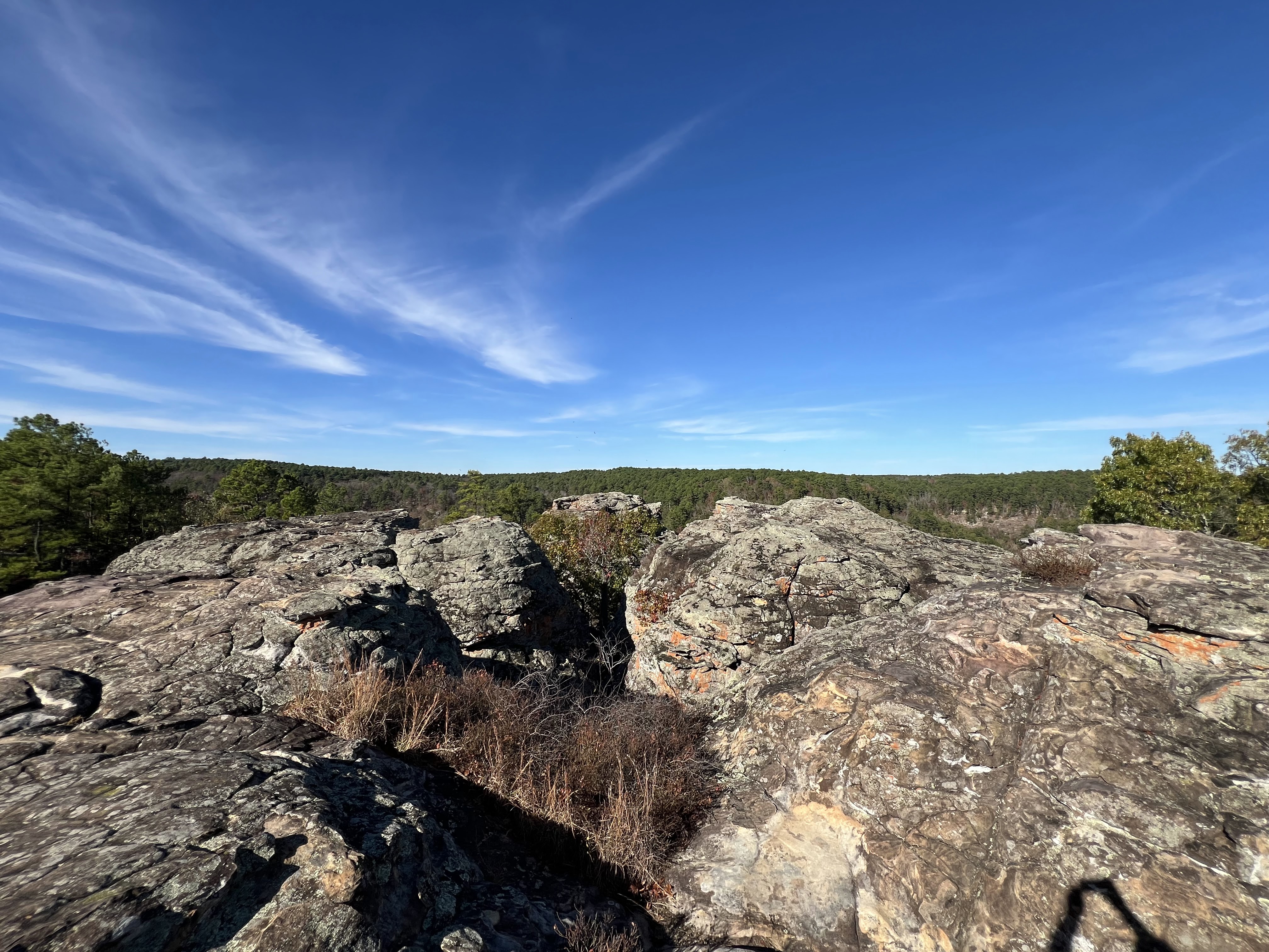While out exploring the guys took a hike around the Bear Cave Trail. On the Bear Cave Trail you walk under, around, through and over gigantic sandstone boulders high above the Cedar Creek drainage. The rock outcrop is visible from Mather Lodge back steps.
